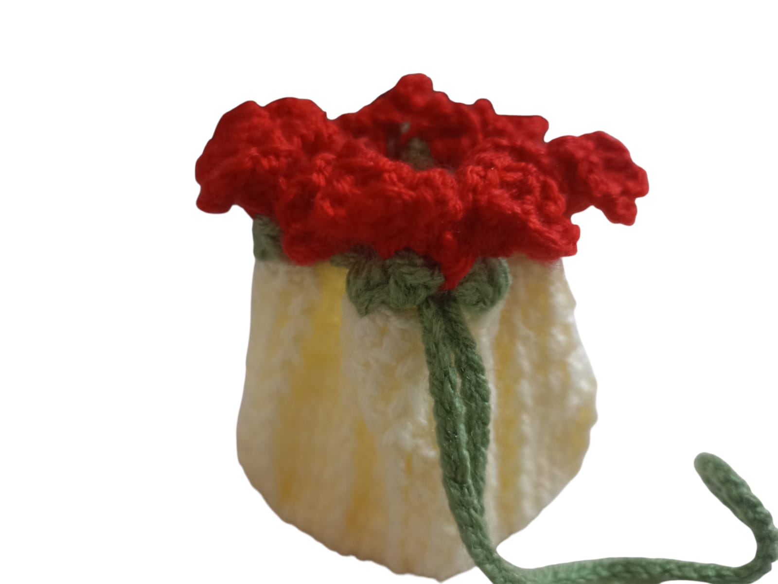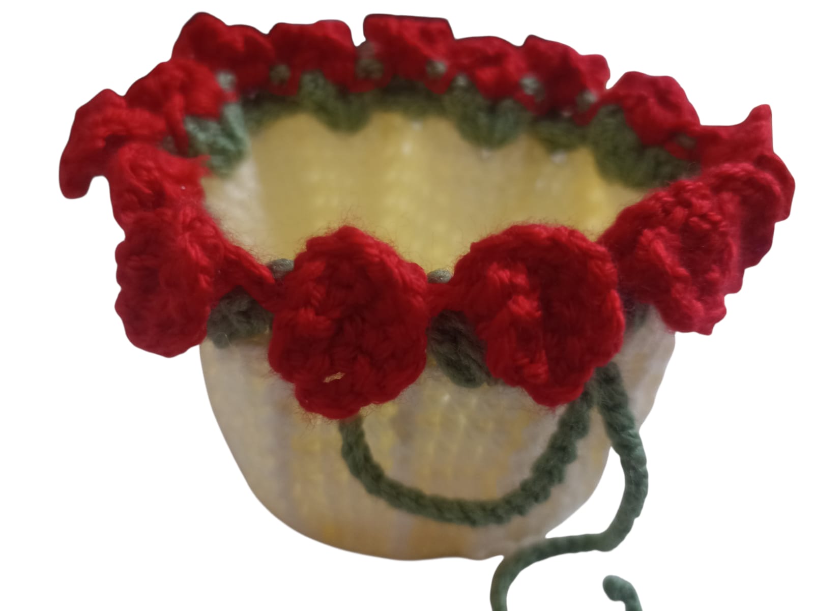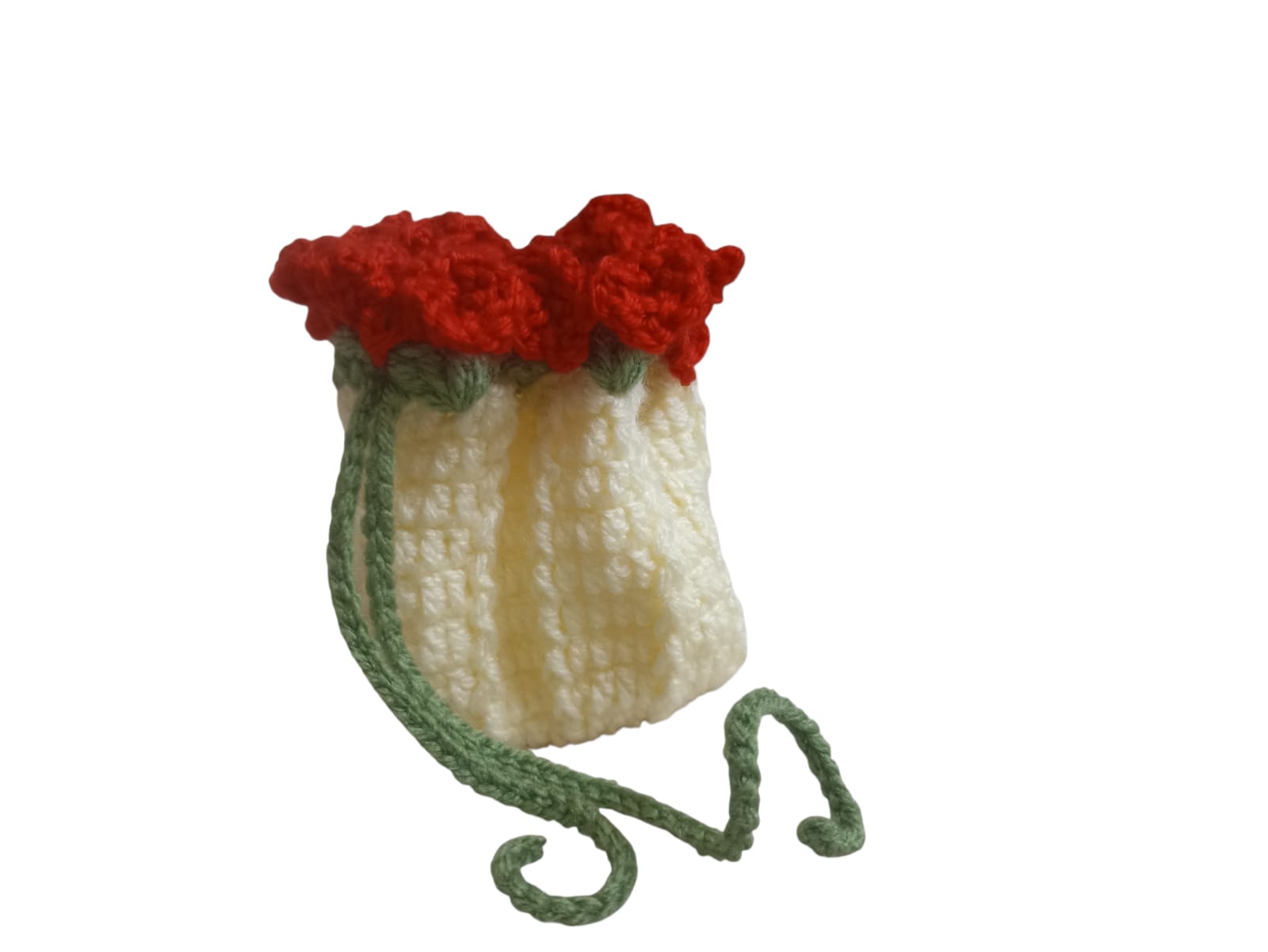 Handmade crochet coin purse featuring a unique design decorated with beautiful 3D red flowers. Carefully crafted using high-quality yarn, it comes with a secure drawstring closure to keep your coins and small items safe. Perfect for storing coins, earphones, or small accessories. Also makes a lovely handmade gift.