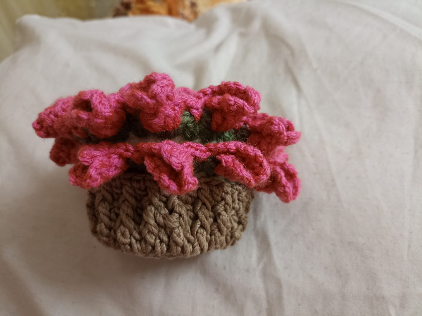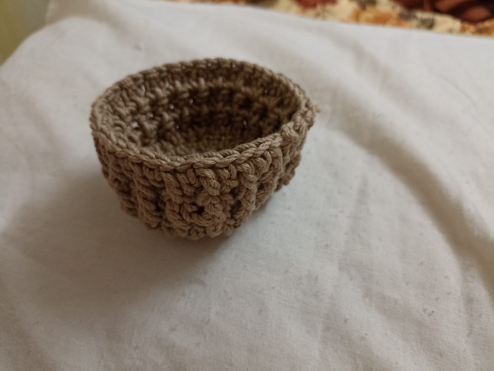 Handmade crochet coaster with a small basket featuring a design resembling a floral diary. Perfect for decorating your table and adding a warm, natural touch to your home. Ideal for holding cups or small gifts. Made with soft and durable materials, combining practicality with charm.